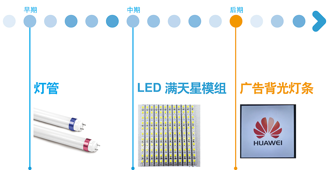 廣告光源從最開始的燈管到后來的LED模組,直到目前的廣告背光源燈條,其發(fā)展路徑與電視光源的完全相似。未來的市場也一定會(huì)像TV背光市場一樣廣闊。